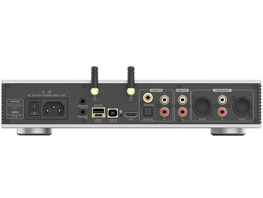 The X9 is equipped with an extensive range of connectivity options, including HDMI ARC, optical, coaxial, analog inputs, USB-B/USB-C, 12V trigger ports, and dual subwoofer outputs. This allows for seamless integration into various audio setups, providing flexibility for both home and professional audio environments. As a reference-grade DAC, headphone amplifier, and preamplifier, the X9 delivers exceptional signal control and dynamic audio performance, setting a new standard in desktop audio.