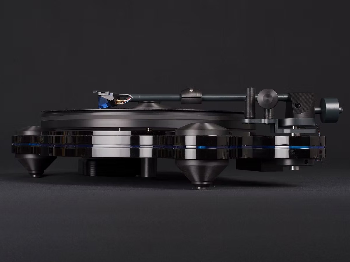 The turntable comes equipped with the new Origine tonearm and with or without a supplied Ortofon MC-1 Turbo; a high-output moving coil phono cartridge. This unipivot tonearm is cleverly designed with its pivot contact point set on the same plane as the record contact point with the stylus and with the tracking force counterweight for added stability while tracking the grooves. The compliance of a phono cartridge, or the “springiness” of the cantilever/motor suspension assembly, plays an important role with unipivot tonearms. We address this issue by using a movable arm tube weight that we nicknamed “the olive” which allows to vary the tonearm’s effective mass. This adjustability enables to make a better match of compliance and effective mass, thus allowing the use of a very wide range of phono cartridges with the Origine. The Origine tonearm has internal wiring from Cardas Audio!