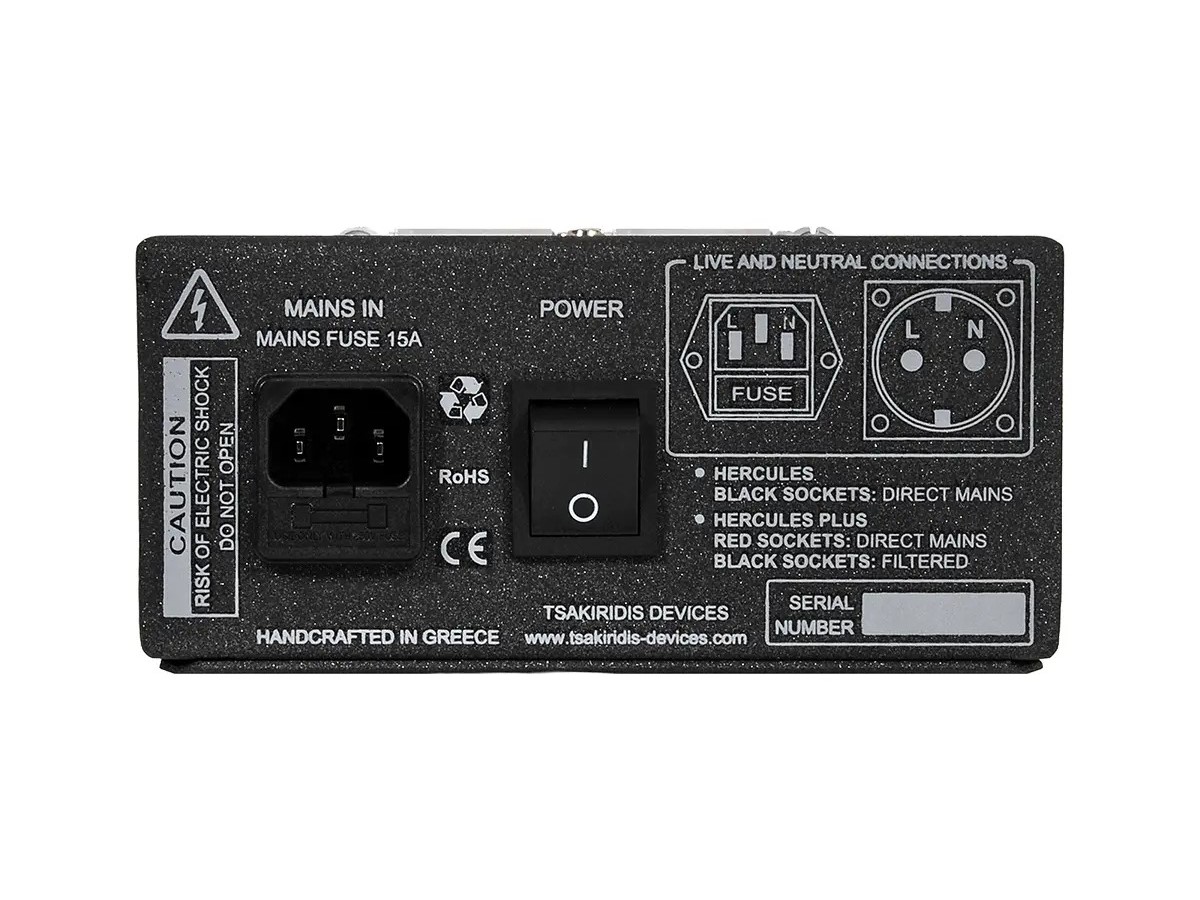 Το Tsakiridis Devices Hercules Plus StaR* Reference ειναι θωρακισμένο πολύπριζο με φιλτρο, 10 υποδοχών Schuko, εσωτερικου διαμοιρασμου καλωδιων αστεροειδους διαταξης Star (3x10 ξεχωριστες καλωδιωσεις, 3x1 για καθε socket. Οι αγωγοι ειναι οκταπλης διατομης σε σχεση με το στανταρ μοντελο και τερματιζονται με ασημοκολληση. Το καλωδιο ρευματος (εσωτερικα προκυπτον) ειναι 2 μετρων AudioQuest Mistral ατερματιστο**.