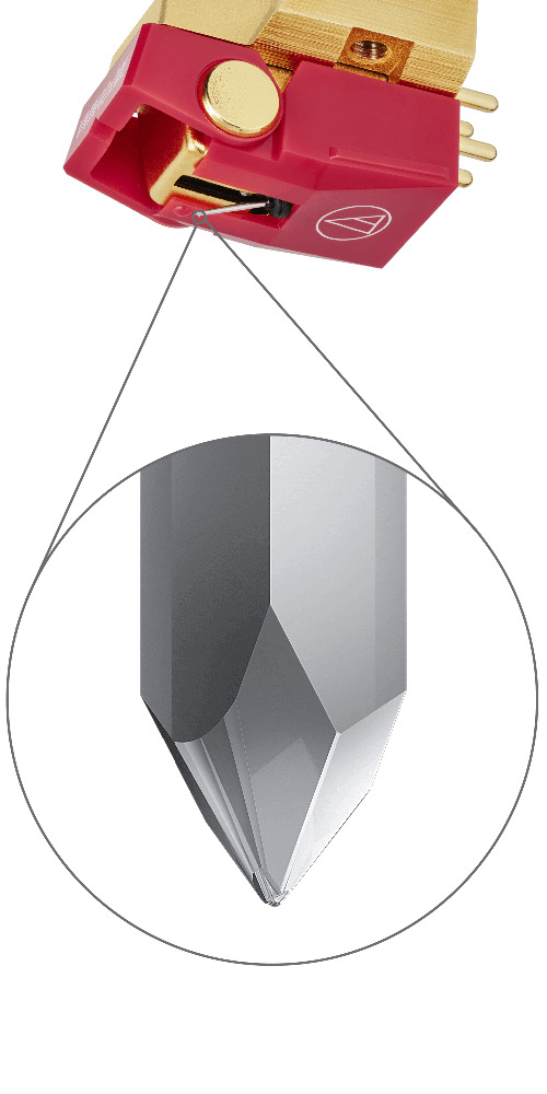 All VMx cartridges feature a generator with paratoroidal coil construction: two coils per channel – one stacked behind the other – for greatly improved efficiency. A center shield plate separates the left and right channels to reduce crosstalk and maintain a clear stereo image. The copper wire used for the coils has been upgraded to PCUHD® (Pure Copper Ultra High Drawability), resulting in richer, more nuanced audio reproduction. The number of coil turns has also been slightly reduced to improve transient response, allowing the cartridge to react more quickly to signal changes for stunningly clean music with lifelike immediacy. The lightweight microlinear stylus of the AT-VM740xML allows it to trace the record groove with incredible accuracy, resulting in nuanced audio reproduction that elliptical and conical styli simply can’t match.