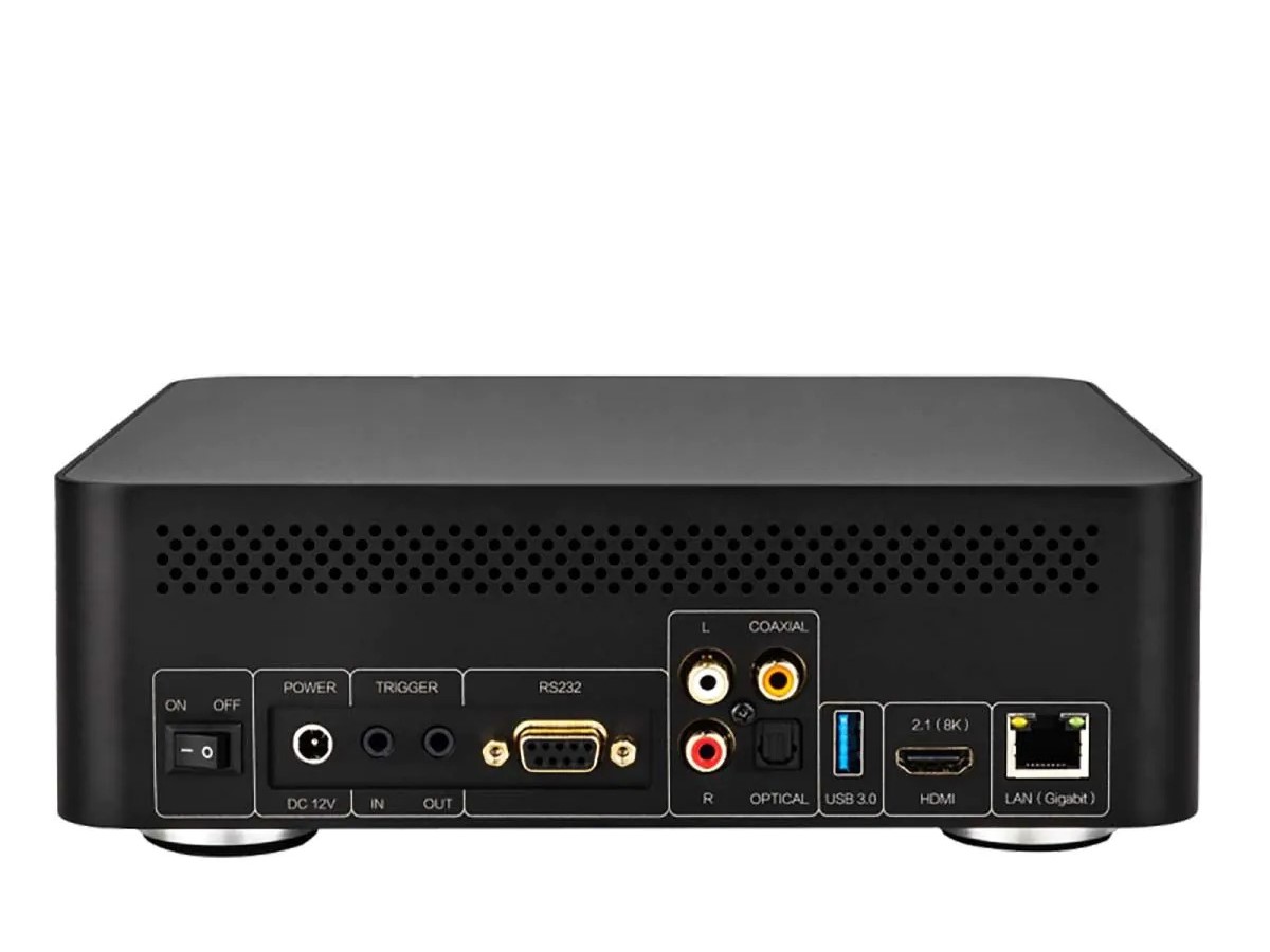 An internal 3.5" SATA 3.0 HDD bay supports capacities up to 24TB, enabling local playback of large movie/music libraries and reducing dependency on external USB storage for high-bitrate content.