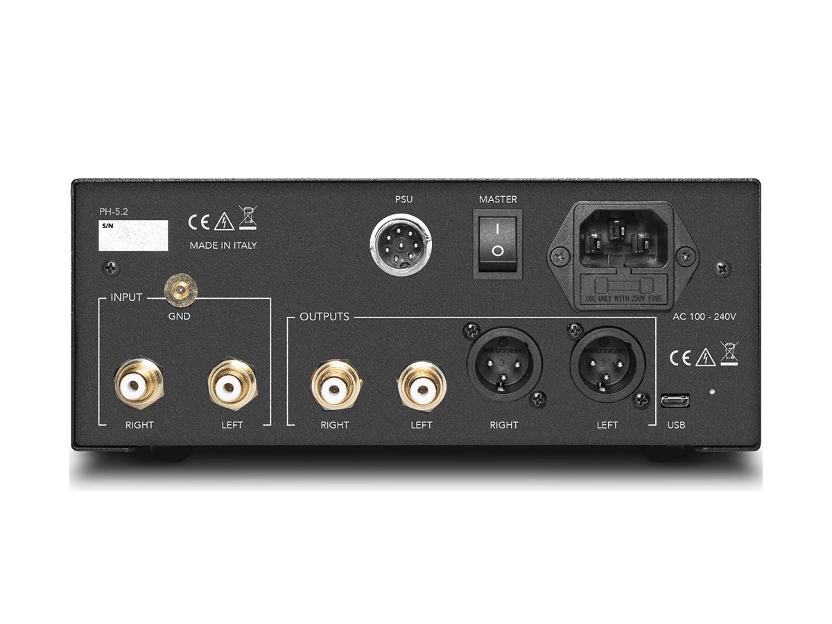 The unit features a redesigned low-noise power supply and a mechanically optimized chassis constructed from sandblasted anodized aluminum to reduce electromagnetic interference and structural resonance. This results in improved dynamic stability, lower background noise, and enhanced resolution. The architecture allows independent storage and recall of MM and MC cartridge settings, enabling precise system matching. Overall, the PH-5.2 is engineered to deliver high linearity, extended bandwidth, and consistent performance under complex signal conditions.