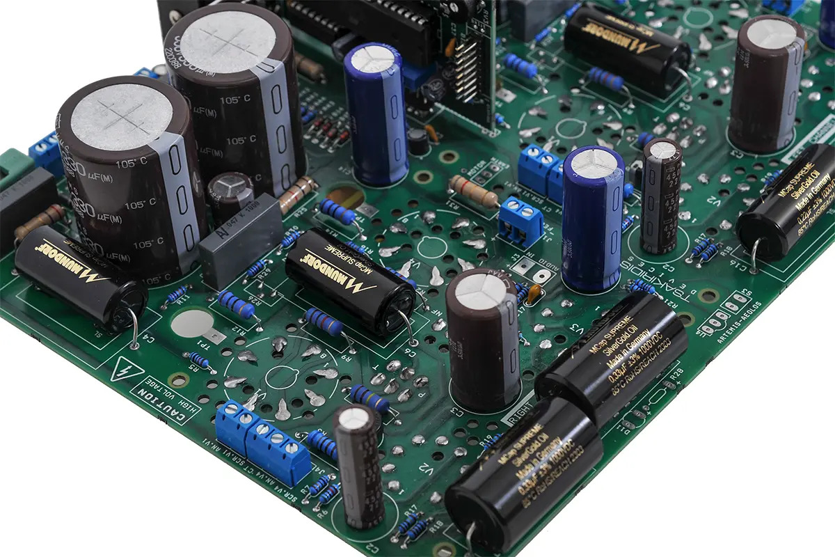 Carefully selected values and types of the electronic components contribute to the reliable circuits operation and the high sound quality of the amplifier. Metal film power resistors and premium quality oil capacitors (Mundorf Supreme Silver Gold Oil – Rike Ausdio QCap4 Copper Oil) on the signal path are used in Artemis Ultima. The meticulous PCB design ensures excellent behavior in SNR, distortion and channel separation.