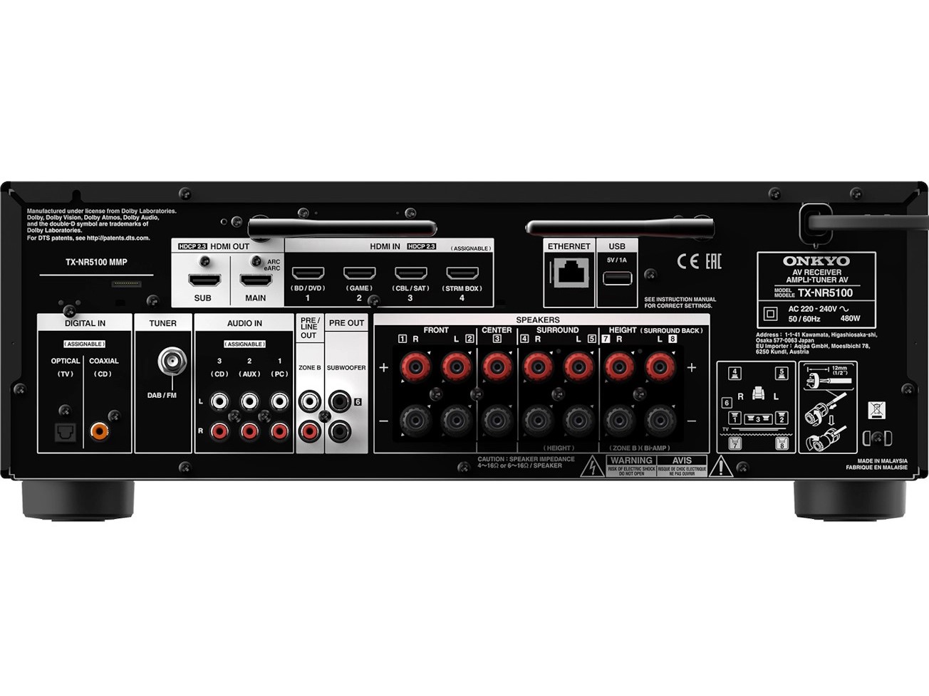 - Dolby Atmos and DTS:X™ processing for use with in-ceiling or "height" speakers for more enveloping home theater sound