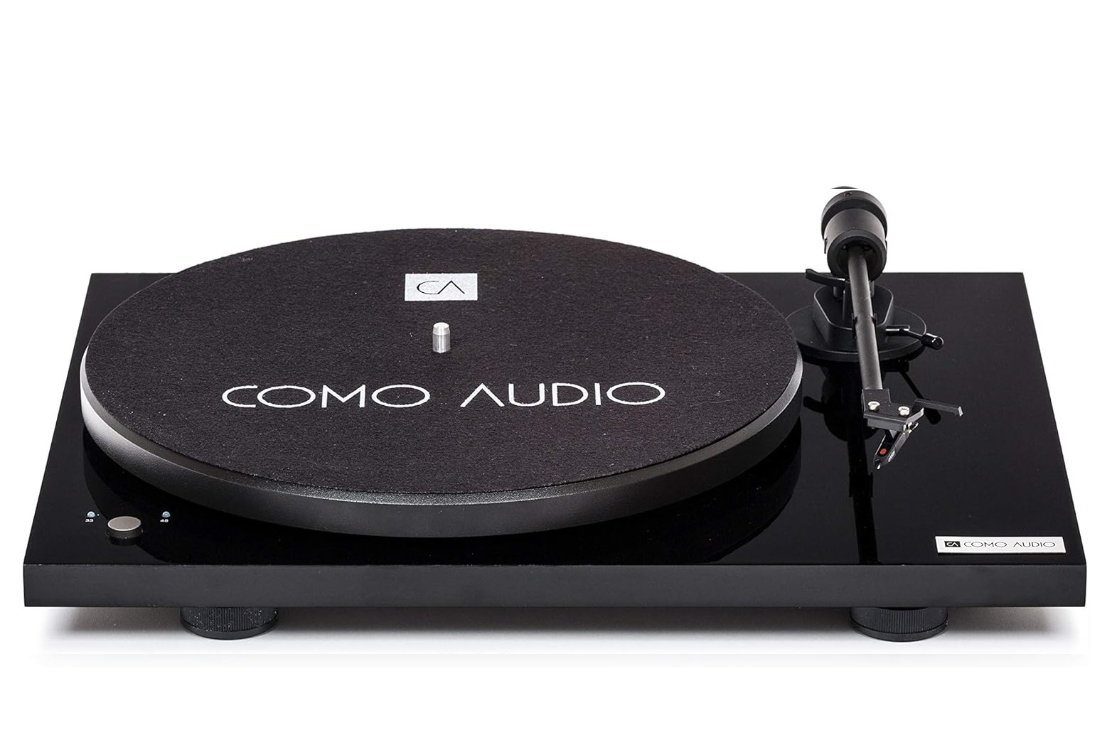 The button located on the left of the Como Audio turntable is used to select the speed and the two LED lights indicate the 33.3/45 rpm. The platter is made of steel while the tonearm is made of 8.6-inch straight aluminum. The support feet are highly absorbent and perfectly decouple the turntable base from external vibrations.